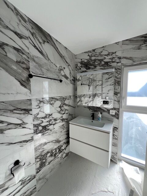 - 1 Badezimmer von 9,7 m2 mit WC, Badewanne, Waschbecken, Anschluss für Waschsäule.